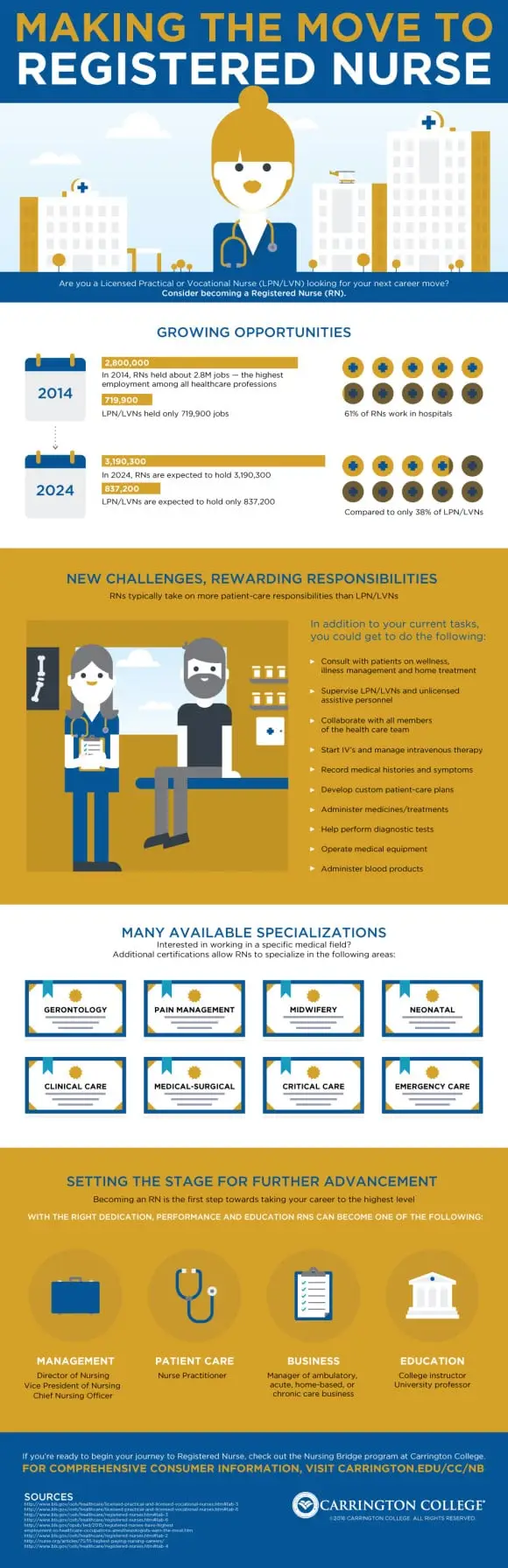Additional Sources: [1] – Bureau of Labor Statistics, U.S. Department of Labor, Occupational Outlook Handbook, 2016-17 Edition, Registered Nurses, on the Internet at http://www.bls.gov/ooh/healthcare/registered-nurses.htm [2] – http://www.bls.gov/ooh/healthcare/registered-nurses.htm#tab-3 [3] – http://www.bls.gov/ooh/healthcare/licensed-practical-and-licensed-vocational-nurses.htm#tab-3 [4] – http://www.bls.gov/ooh/healthcare/licensed-practical-and-licensed-vocational-nurses.htm [5] – http://www.bls.gov/ooh/healthcare/registered-nurses.htm#tab-1 [6] – http://www.bls.gov/ooh/healthcare/registered-nurses.htm#tab-2 [7] – http://www.bls.gov/ooh/healthcare/registered-nurses.htm#tab-2 [8] – http://www.bls.gov/ooh/healthcare/registered-nurses.htm#tab-2 [9] – http://www.bls.gov/ooh/healthcare/registered-nurses.htm#tab-1 [10] – http://www.bls.gov/ooh/healthcare/registered-nurses.htm#tab-3
