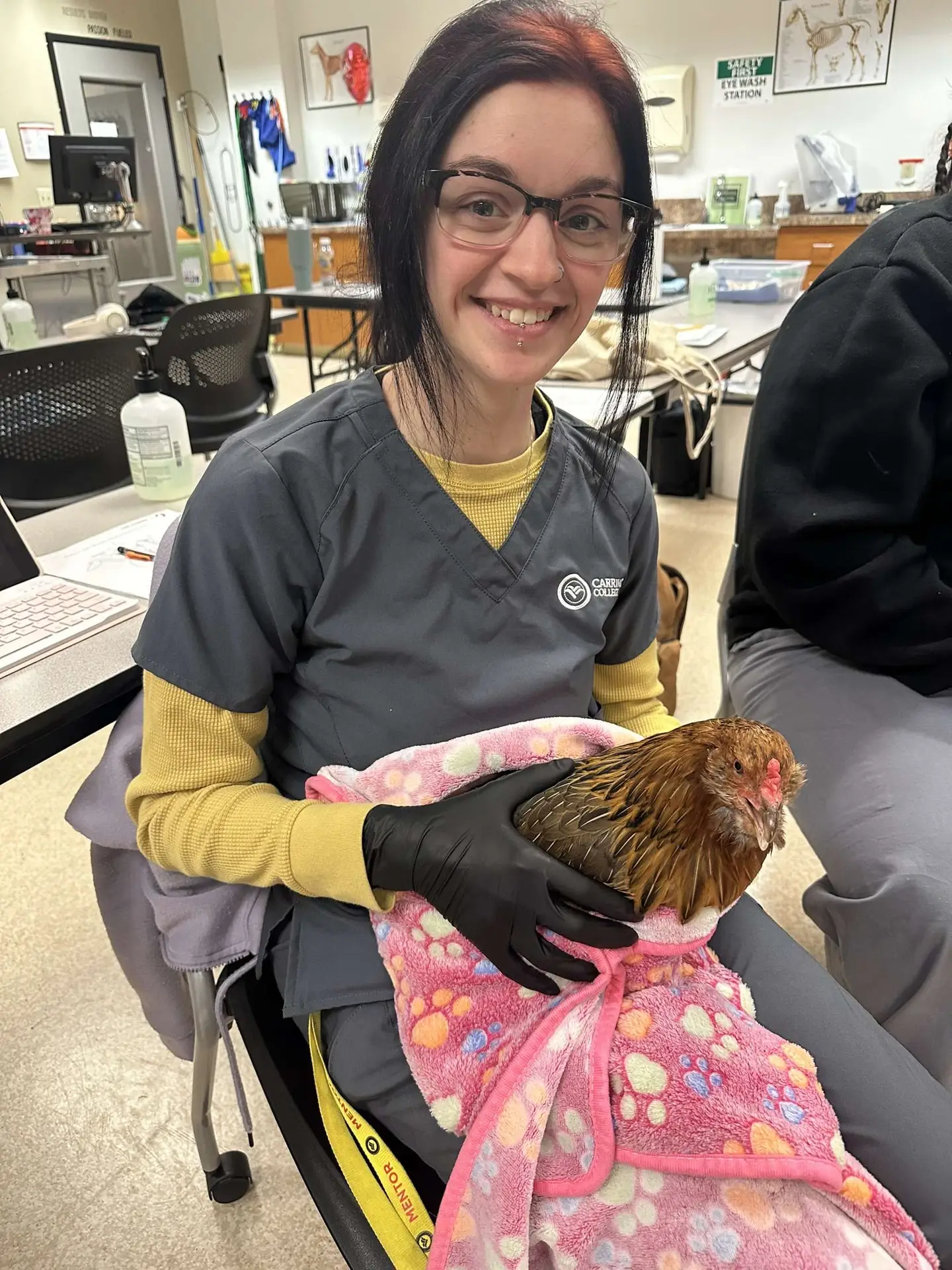 It was pretty cool to have some animals in class. Classmates and our instructor brought in animals…dogs, cats, chickens. We took vitals, drew blood on cats and dogs, clipped chickens’ wings so they couldn’t fly out of their coops. It was pretty educational.